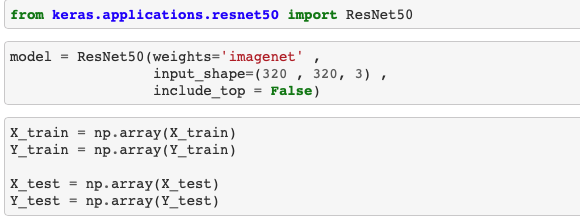 keras에서 ResNet50을 불러옵니다. 그리고 훈련 및 테스트 데이터를 모두 numpy array로 변경합니다.