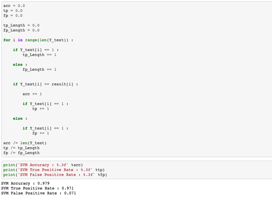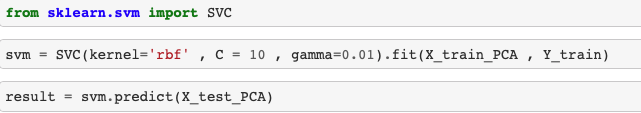 이제 여기서 주성분 분석이 된 훈련 데이터로 SVM을 학습시키고 테스트 데이터에 대한 분류 결과를 구합니다.