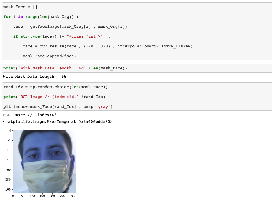 주의 할 점은 얼굴 검출하는 과정에서 마스크를 착용한 경우 얼굴 검출이 제대로 되지 않은 경우가 많았고 그 결과 이미지 데이터 갯수가 66개 밖에 되지 않았습니다.