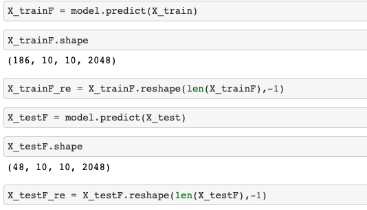 훈련 데이터 , 테스트 데이터에서 특성을 추출한 결과 아래와 같이 (320 ,320, 3) 이미지 데이터가 (10 , 10 , 2048) 이 된 것을 확인할 수 있습니다. 이를 주성분 분석을 위해서 1차원으로 변경해줍니다.