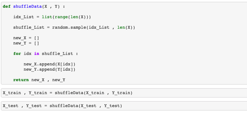위 분할하는 과정에서 훈련 데이터가 마스크를 착용한 사진 a개 , 마스크를 착용하지 않은 사진 b개로 저장되어 있으니 이를 셔플해서 순서를 무작위로 재선정합니다.