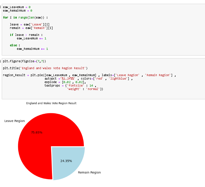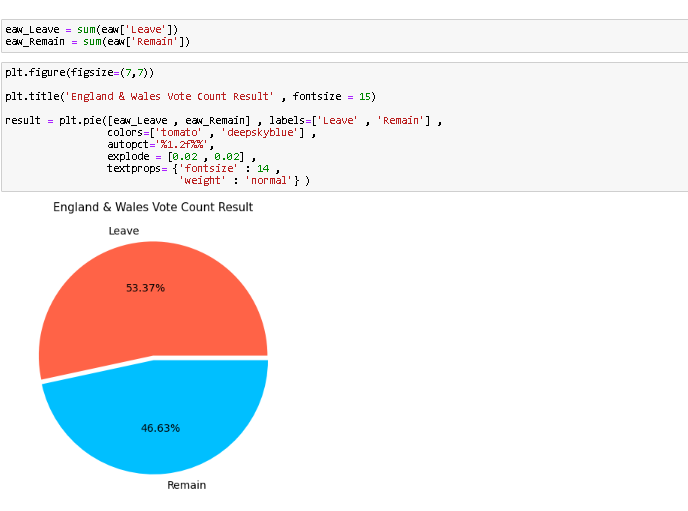 Part1에서는 Brexit 투표 결과를 분석 및 시각화하기 위해서 census.csv 데이터를 이용해서 UK 에 속하는 각 나라별 인구 수 차이를 확인해보았습니다. 그리고 지역구 이름을 연결지어서 referendum 에 있는 지역구가 어디 나라에 속하는지를 알아보고 해당 지역구의 투표 결과 정보를 이용해서 England 그리고 Wales에서의 투표 결과를 확인하였습니다.