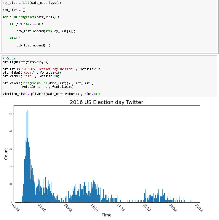 히스토그램을 살펴본 결과 해당 데이터는 2016 US 선거 날 당시의 트위터 정보를 가지고 있음을 확인할 수 있었습니다. 새벽 일찍에 트위터 갯수가 가장 많음을 확인할 수 있었고 점심 시간 그리고 저녁 시간 이렇게 3번 정도 트위터 갯수가 많은 구간이 있었습니다.