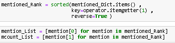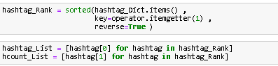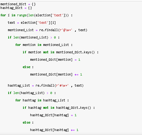 re.findall(r'#\w+') , re.findall(r'@\w+') 등과 같은 정규 표현식을 사용함으로써 Text 안에서 #단어 및 @단어 들의 리스트를 구할 수 있습니다. 이 리스트 안에 있는 단어 각각에 대해서 언급된 횟수를 셉니다.