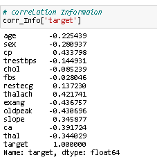 심장병의 유무와 전체 속성들의 상관관계를 파악하기 위해서 상관관계 계수를 구해서 파악해보겠습니다.