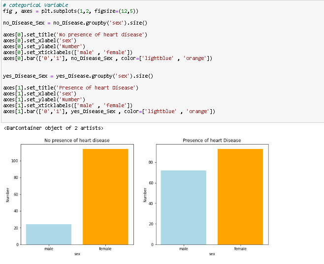 분석 결과 심장병이 없는 데이터의 경우 남성 보다는 여성이 훨씬 많았음을 알 수 있습니다.