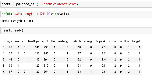 데이터의 총 갯수는 303개인 것을 확인할 수 있습니다.