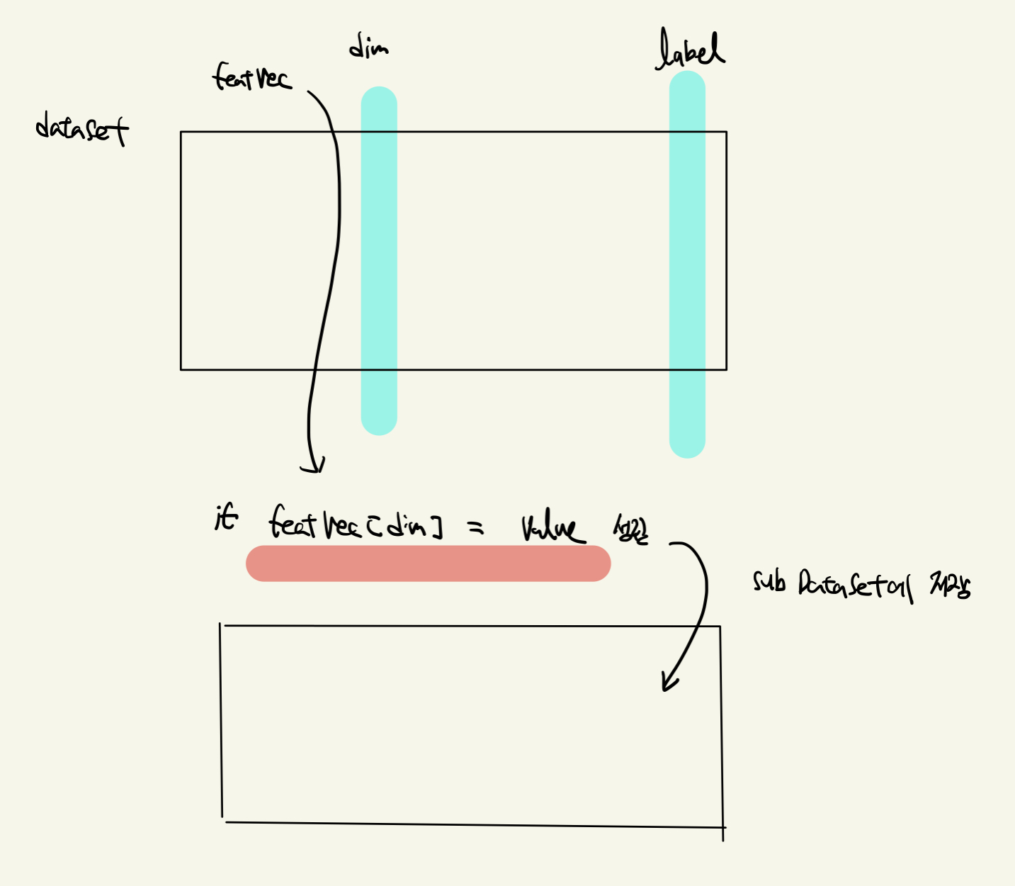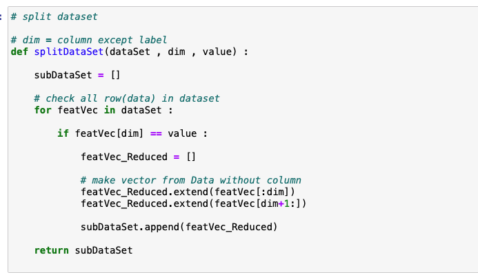 그리고 해당 데이터에서 특정 속성의 특정 값을 만족하면 이를 모아서 서브 데이터를 반환하는 함수를 만든다. 여기서 주의해야 할 점은 데이터를 분할하고 서브 데이터에 저장할 때 사용된 속성은 제외하고 저장한다는 것입니다.