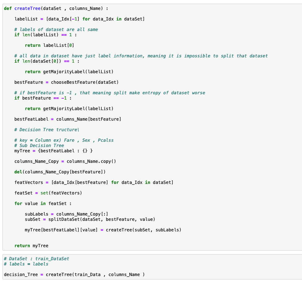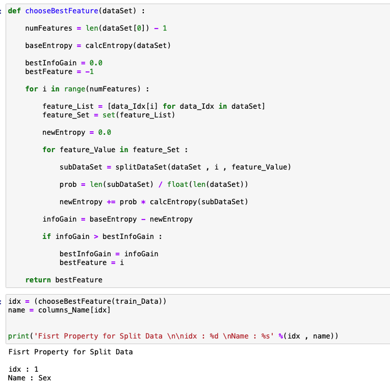 위 두개의 함수를 이용해서 인자로 받은 데이터 중에서 "어떠한 속성으로 분할 이후에 엔트로피가 가장 줄어드는가?" 를 파악하고 해당 속성의 해당 값으로 데이터를 분할합니다.