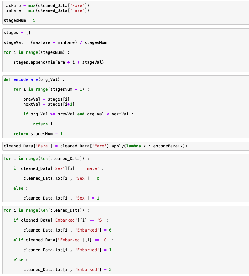차례대로 Fare의 최댓값 최소값을 파악해서 이를 5구간으로 나누고 0 ~ 4 값으로 Mapping 합니다.
