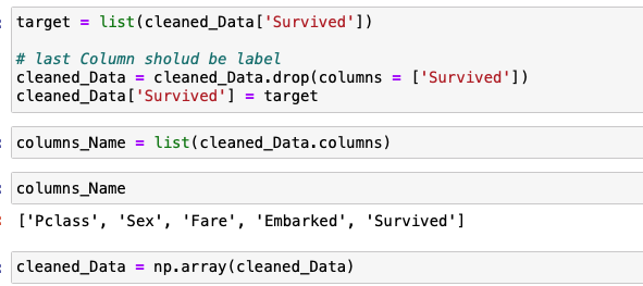데이터에서 Survived 속성을 뺴고 뒤에 다시 붙여줌으로써 Column의 속성을 조정합니다. 그리고 Pandas DataFrame 구조에서 array로 데이터 구조를 변경합니다.