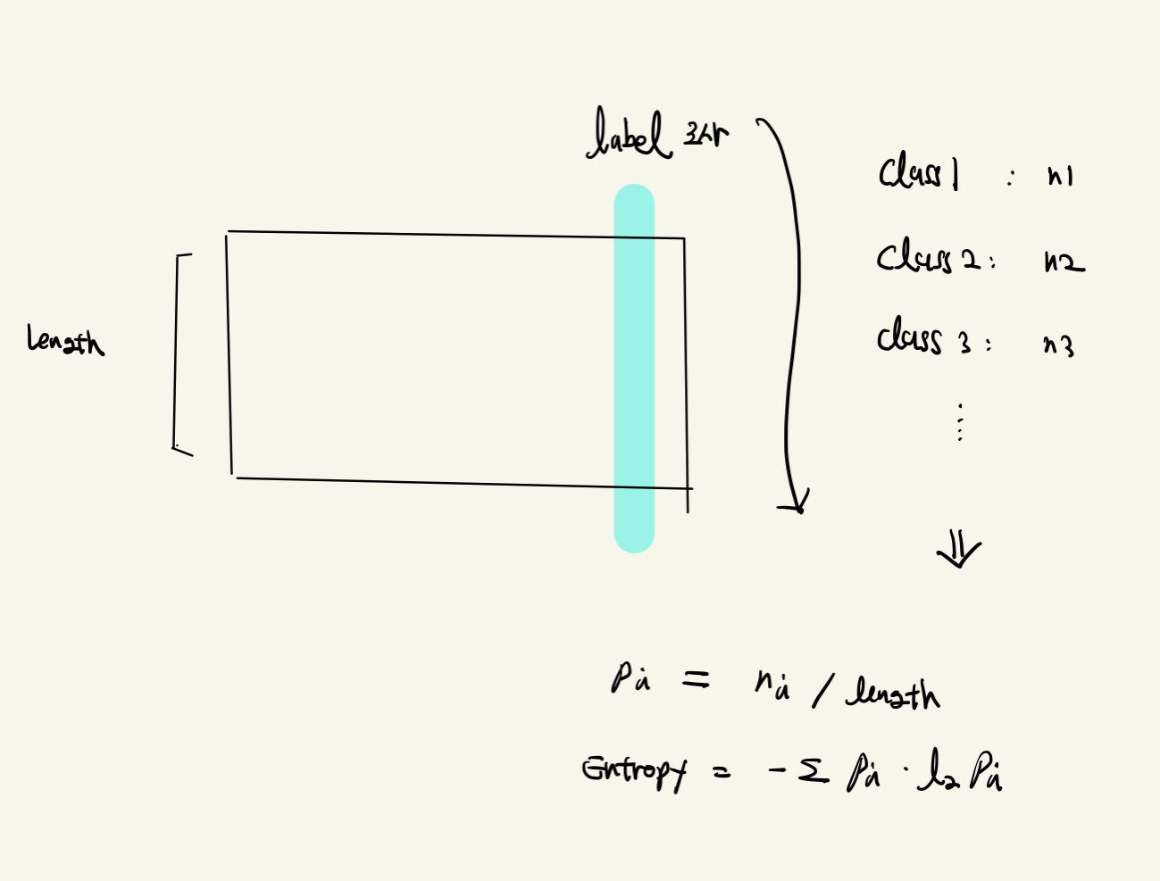 그리고 이를 데이터 전체 갯수로 나누어서 각 label 클래스의 확률을 구하고 이를 이용해서 해당 데이터의 복잡도 = 엔트로피를 구합니다.