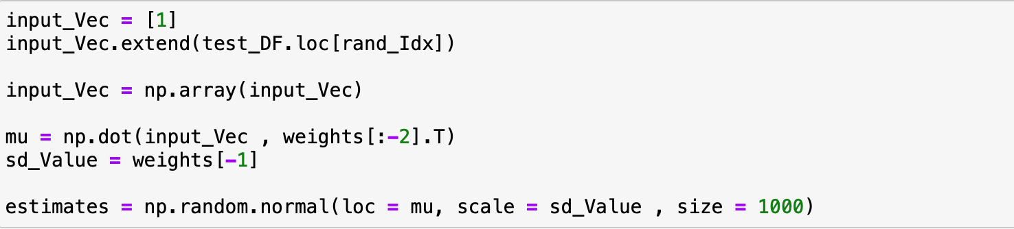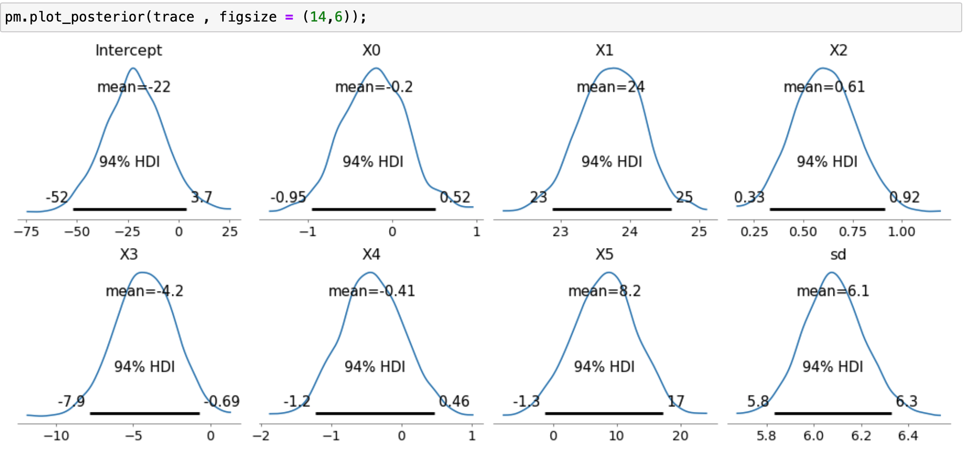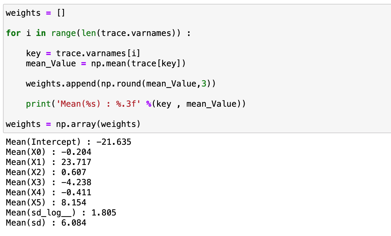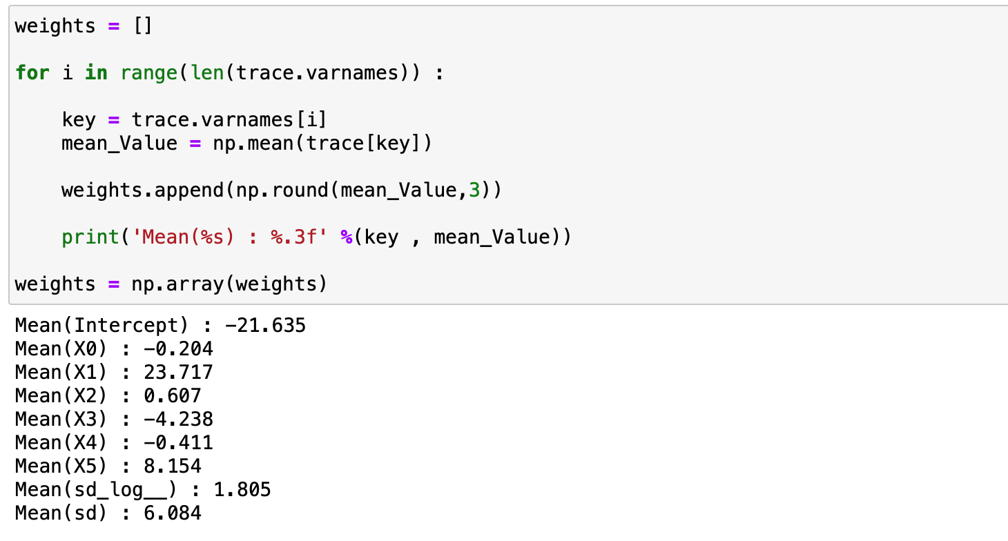 저는 이 각 변수의 사후 확률 분포의 평균 값을 이용해서 선형 회귀를 해보도록 하겠습니다.