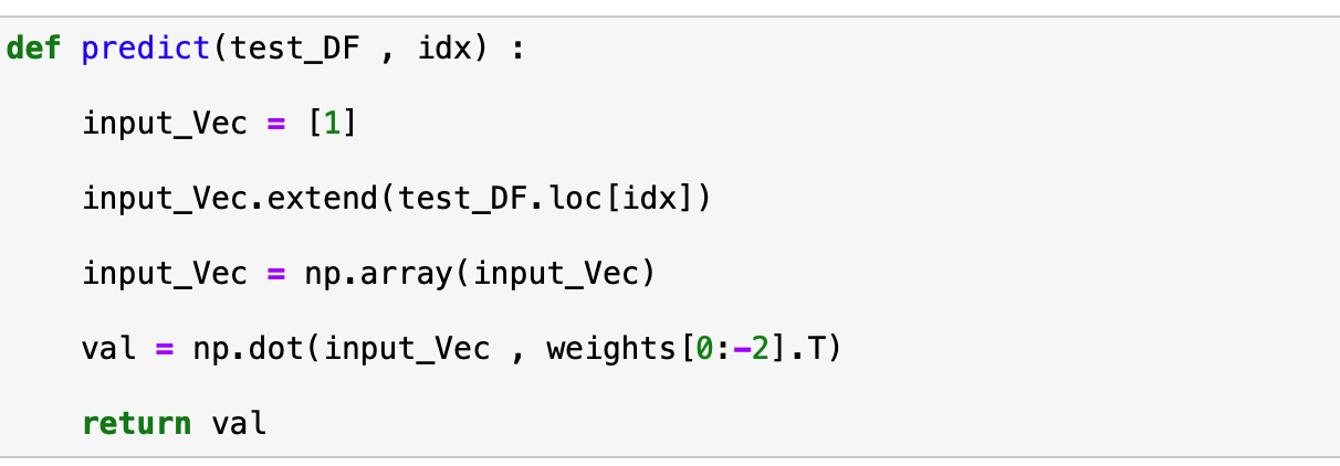 따라서 저희는 Intercept , X0 ~ X5 총 7개의 평균 값과 테스트 데이터에 1을 추가한 input Vec과 연결해서 청구 비용을 예측합니다.