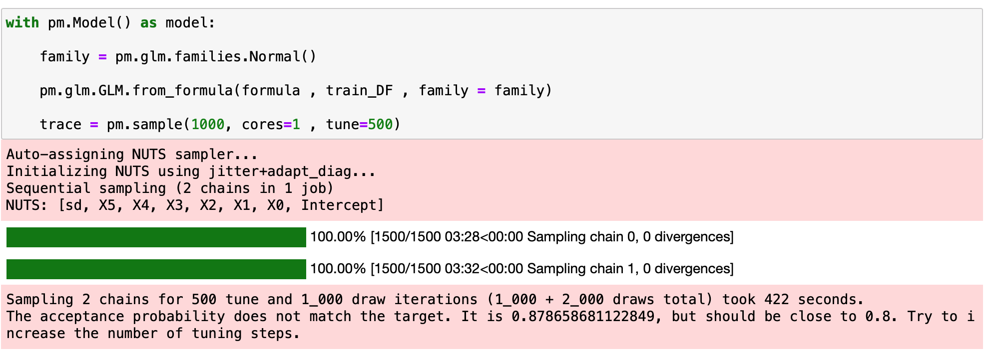 여기서 사후 확률 분포를 바로 얻을 수 없어서 여러 샘플을 얻어서 사후 확률 분포를 구하는데 이를 pm.sample 함수를 이용해서 실행합니다.