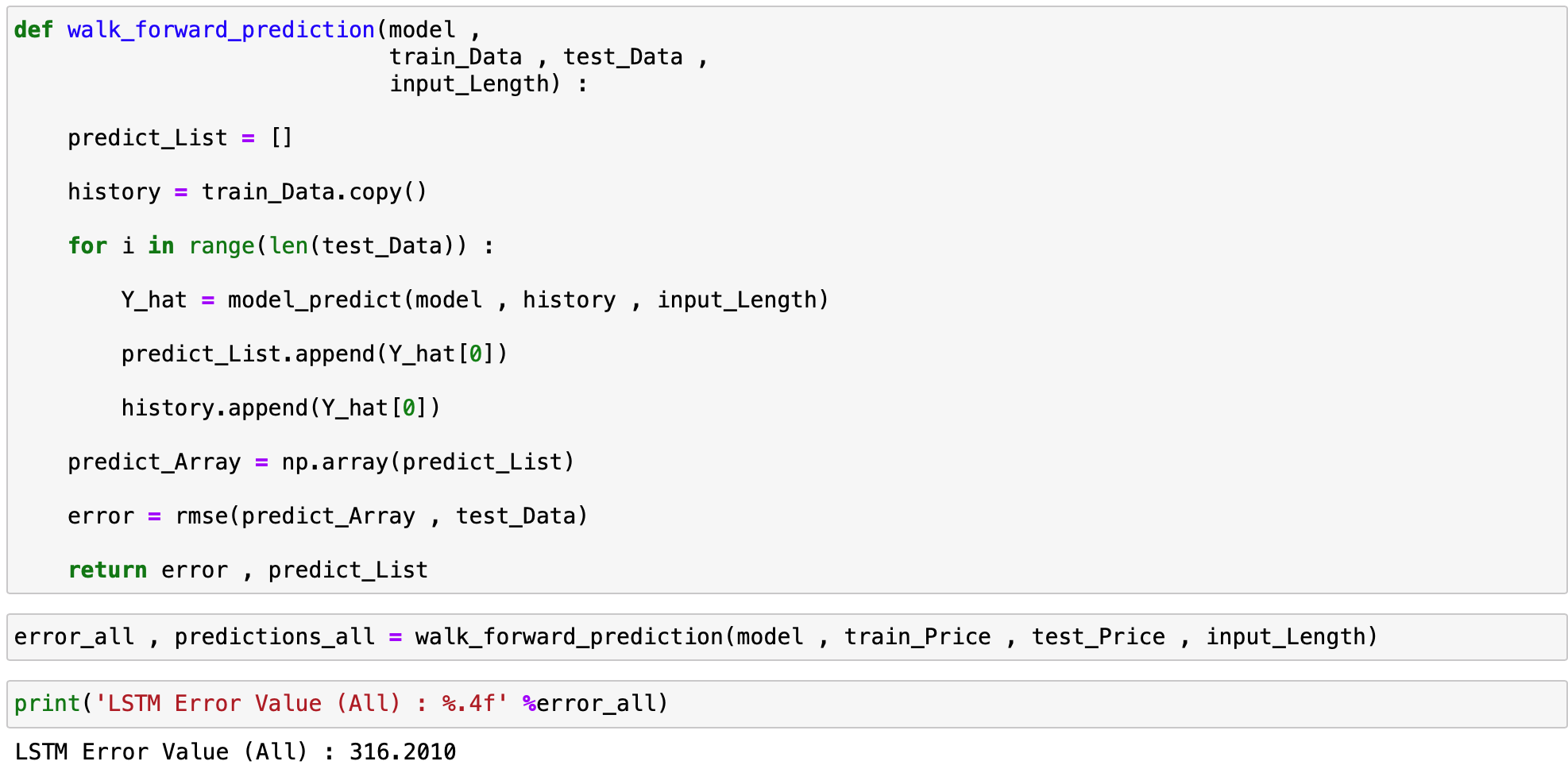 위에서 확인할 수 있다시피 hitory에 실제 값을 하나씩 추가하면서 그 history를 이용해서 예측 값을 구하는 구조입니다.