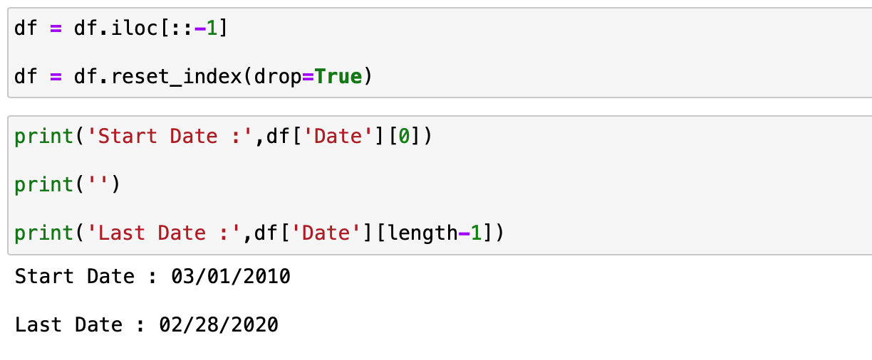 데이터에는 Apple 주식 가격을 2010년 3월 부터 2020년 2월 말 까지있다는 것을 확인할 수 있습니다.