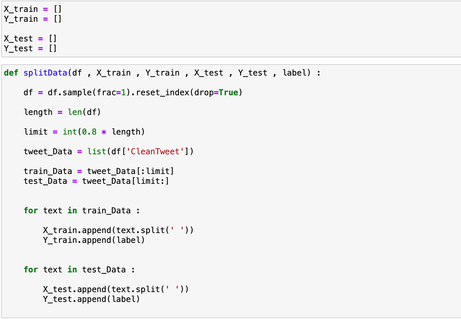여기서 주의할 점은 기존 데이터의 Clean Text는 str 타입이기 때문에 이를 공백을 기준으로 나누어서 word_List 형식으로 훈련 데이터 및 테스트 데이터에 저장해야 한다는 것입니다.