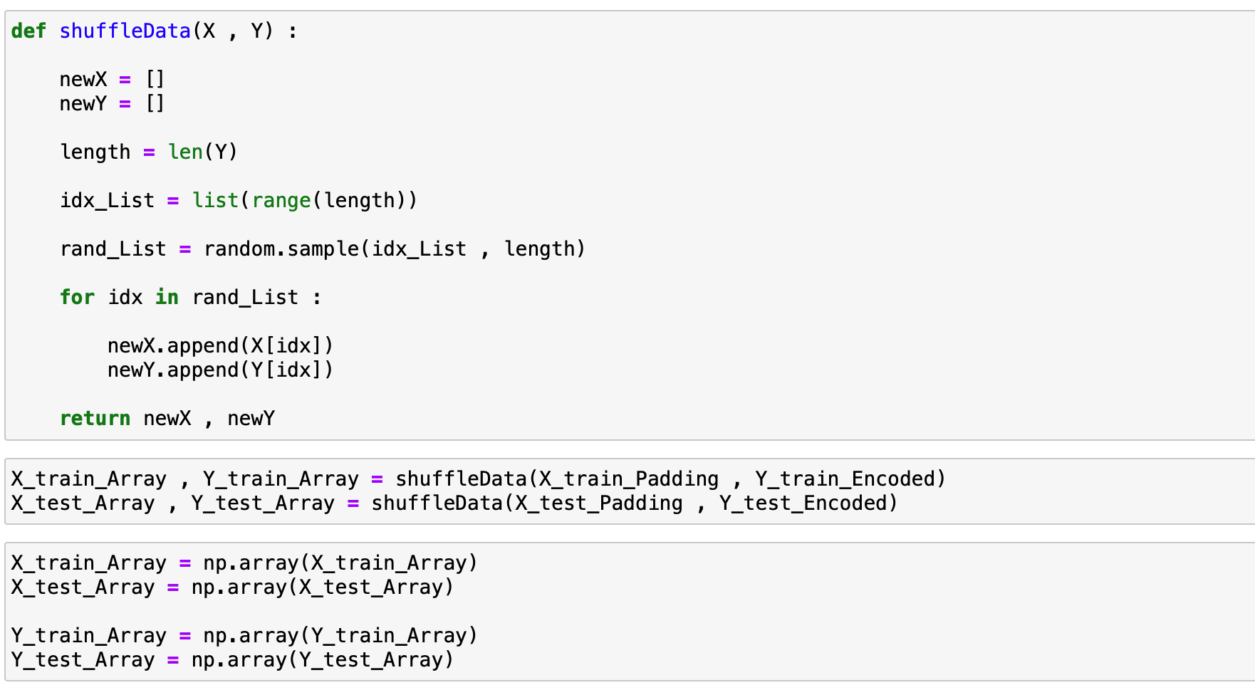 이제 마지막으로 데이터를 분할해서 저장할 때 Neutral , Negative , Positive 등으로 순차적으로 저장하였으니 이를 LSTM에 학습시키기 위해서는 무작위로 섞어 주어야 합니다.