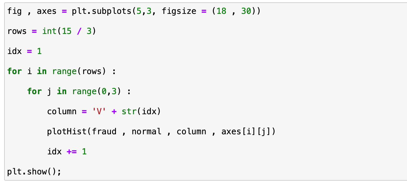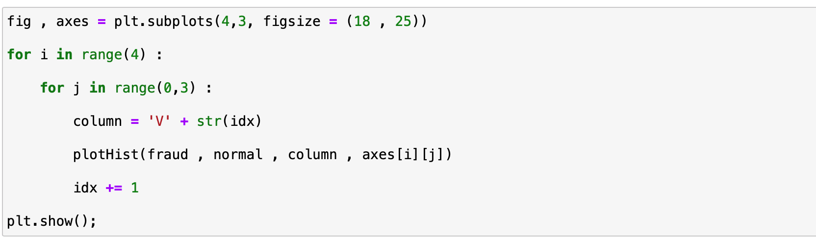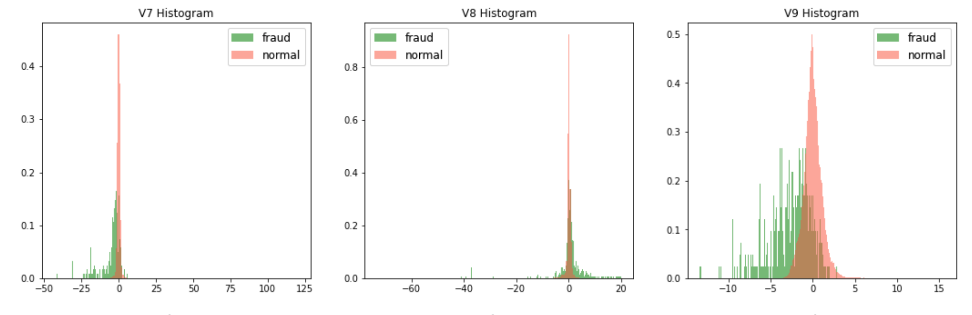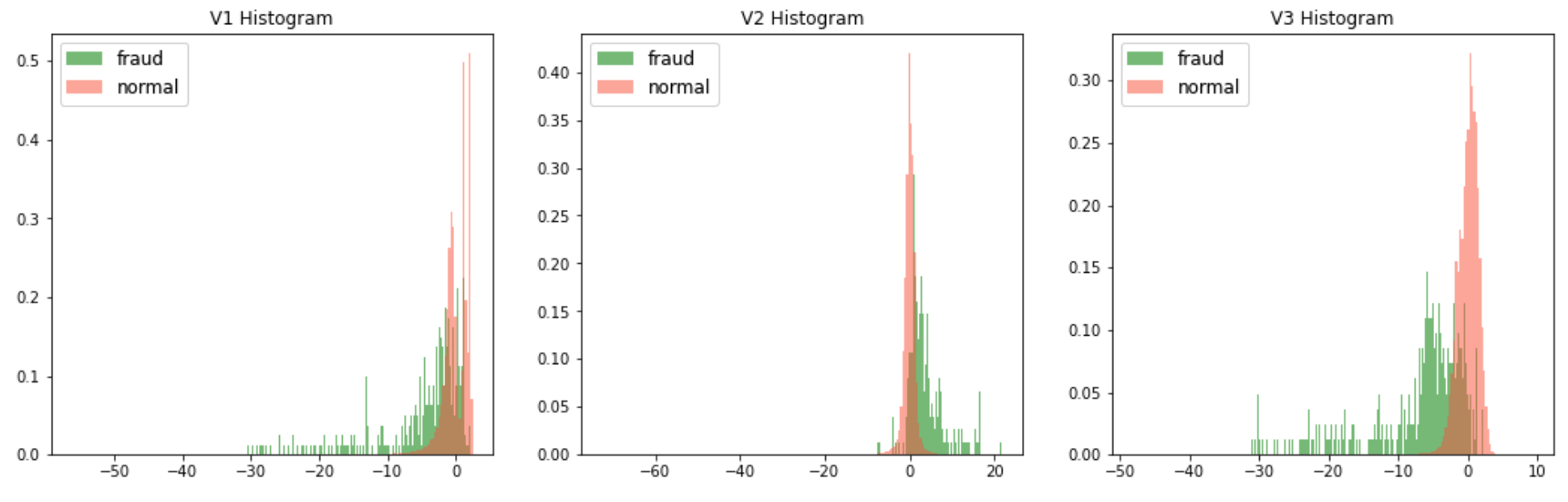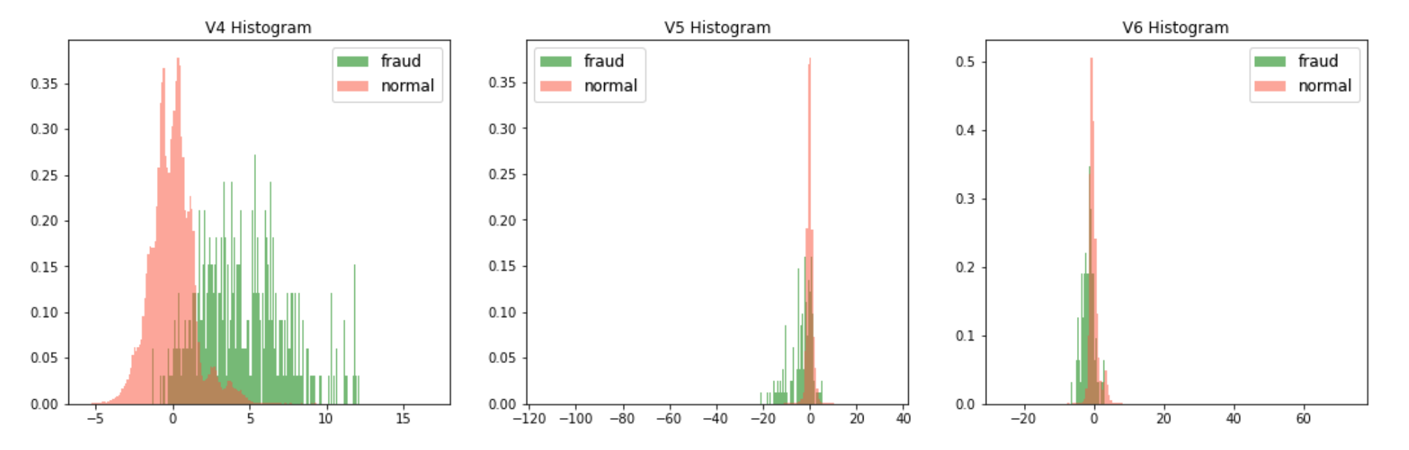 이제 분할된 데이터에서 각 성분의 값들에 대한 Histogram을 그림으로써 fraud와 normal에 차이가 많은 성분을 Logisitic Regression을 훈련하기 위한 특성을 선택해보도록 하겠습니다.