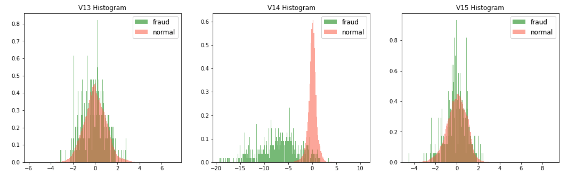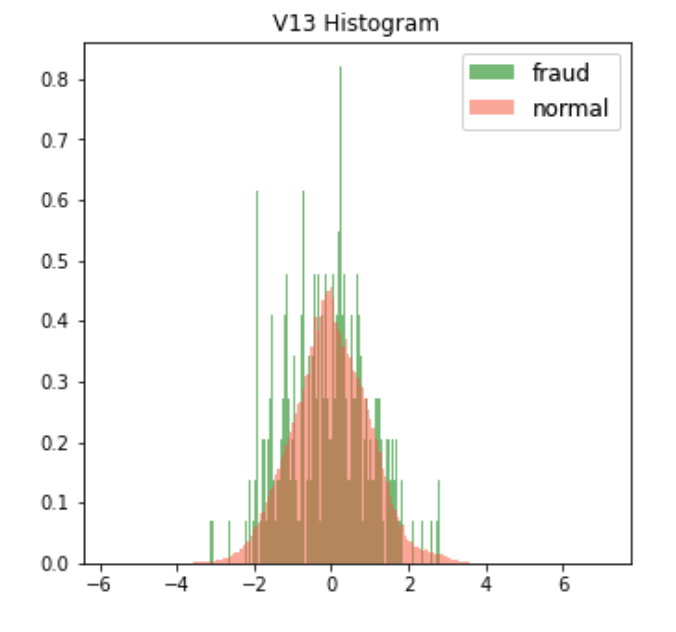 그에 비해서 13번째 속성은 fraud와 normal의 차이가 별로 없어보이니 이 속성은 fraud와 normal를 구별하기에는 그렇게 좋은 속성이 아닙니다.
