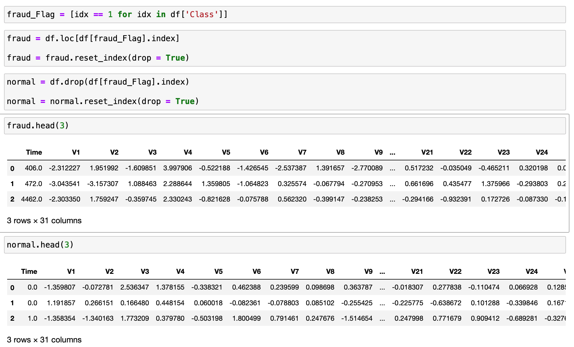 여기서 주성분 분석된 각 column의 데이터를 분석하기 위해서 fraud와 noraml 데이터를 분할하도록 하겠습니다.