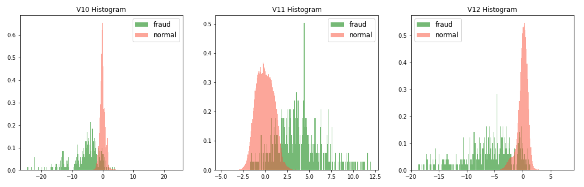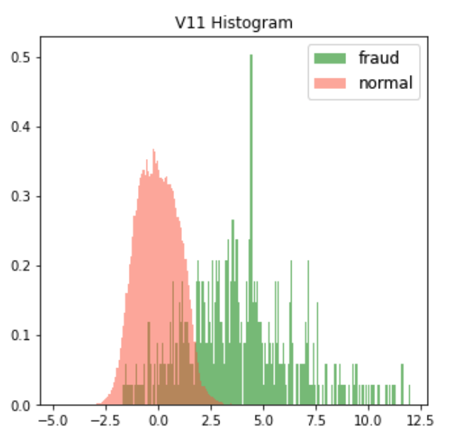 예를 들어서 아래와 같이 11번째 주성분 분석된 속성에 대해서는 fraud와 normal의 Histogram의 차이가 분명하니. 이는 중요한 속성으로 여겨집니다.