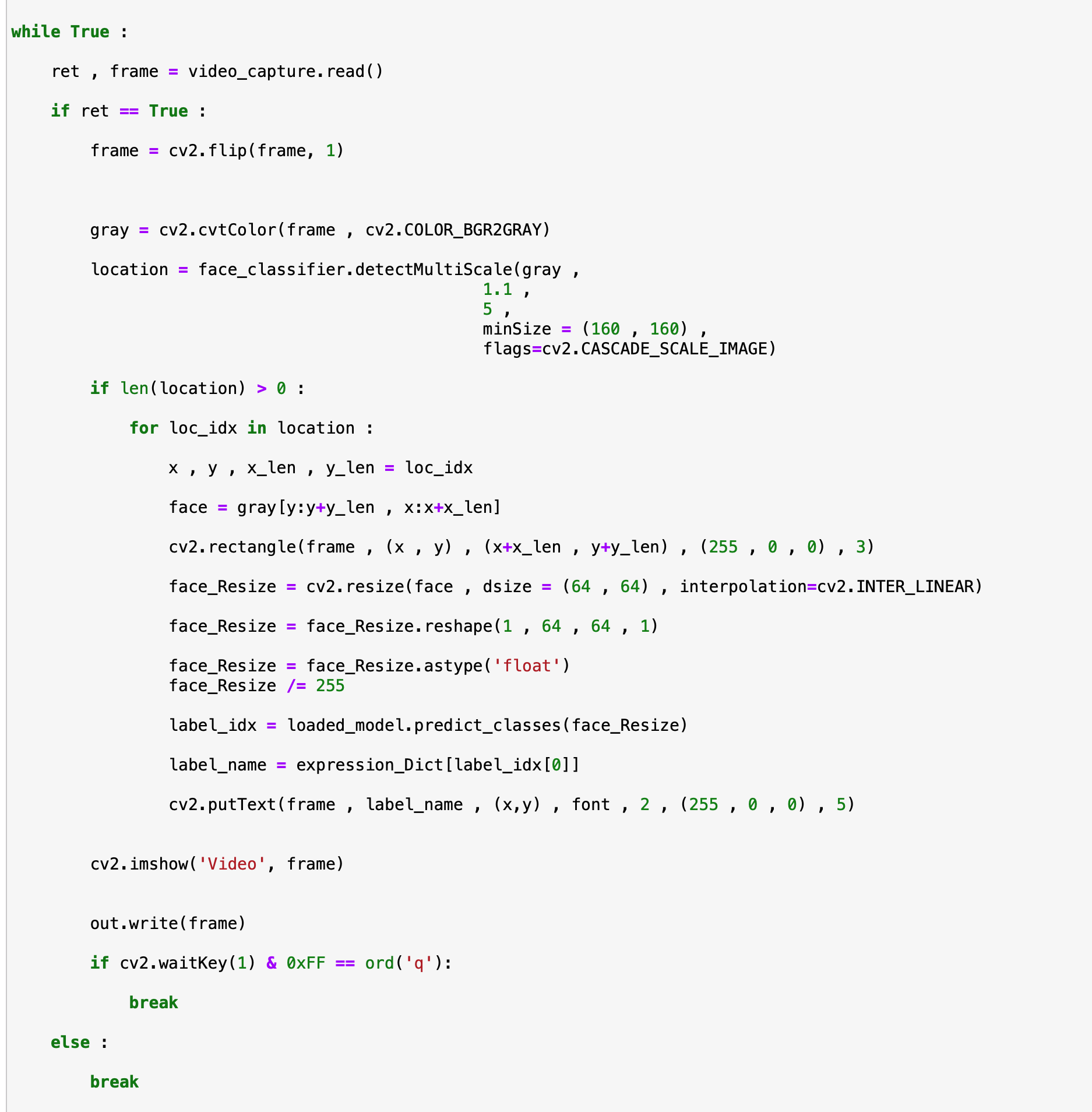 이렇게 전처리된 얼굴 부분을 CNN에 모델에 입력함으로써 label을 파악하고 화면에 표기하도록합니다.