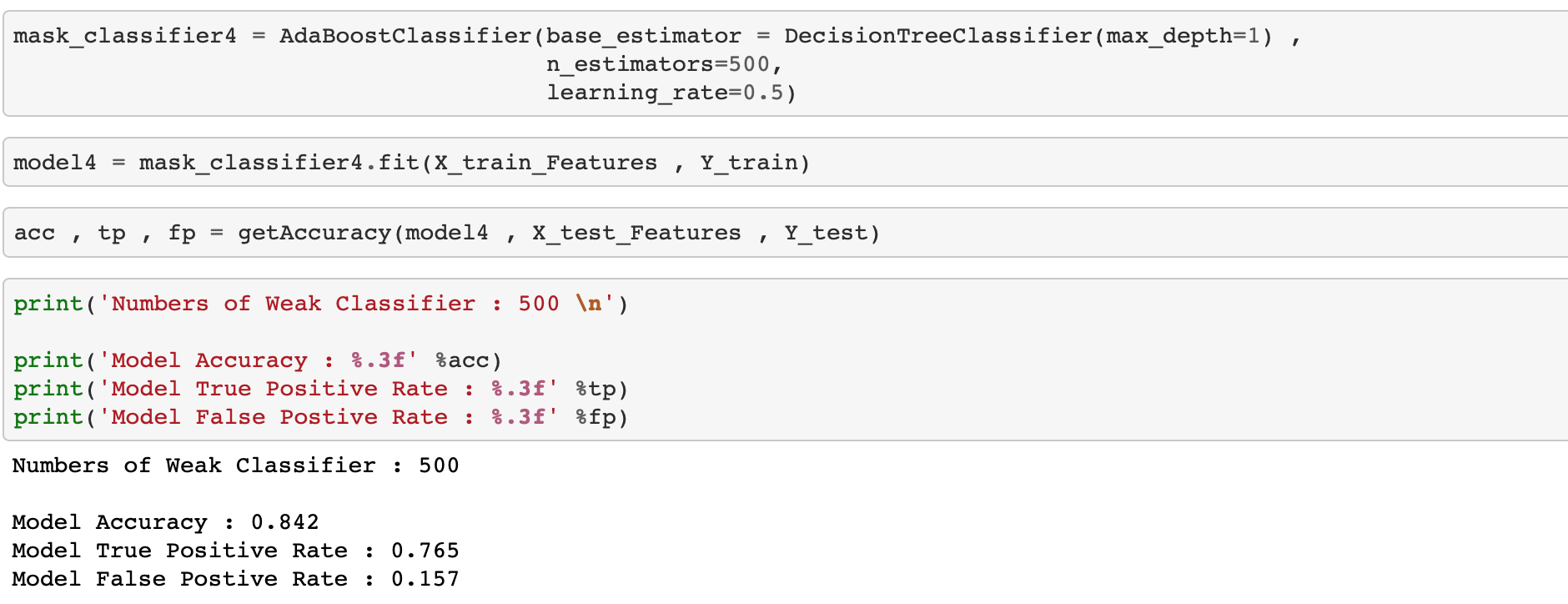 weak classifier 500개를 사용하였을 때 테스트 데이터를 이용해서 분류한 결과 정확도가 84.2%정도 입니다.