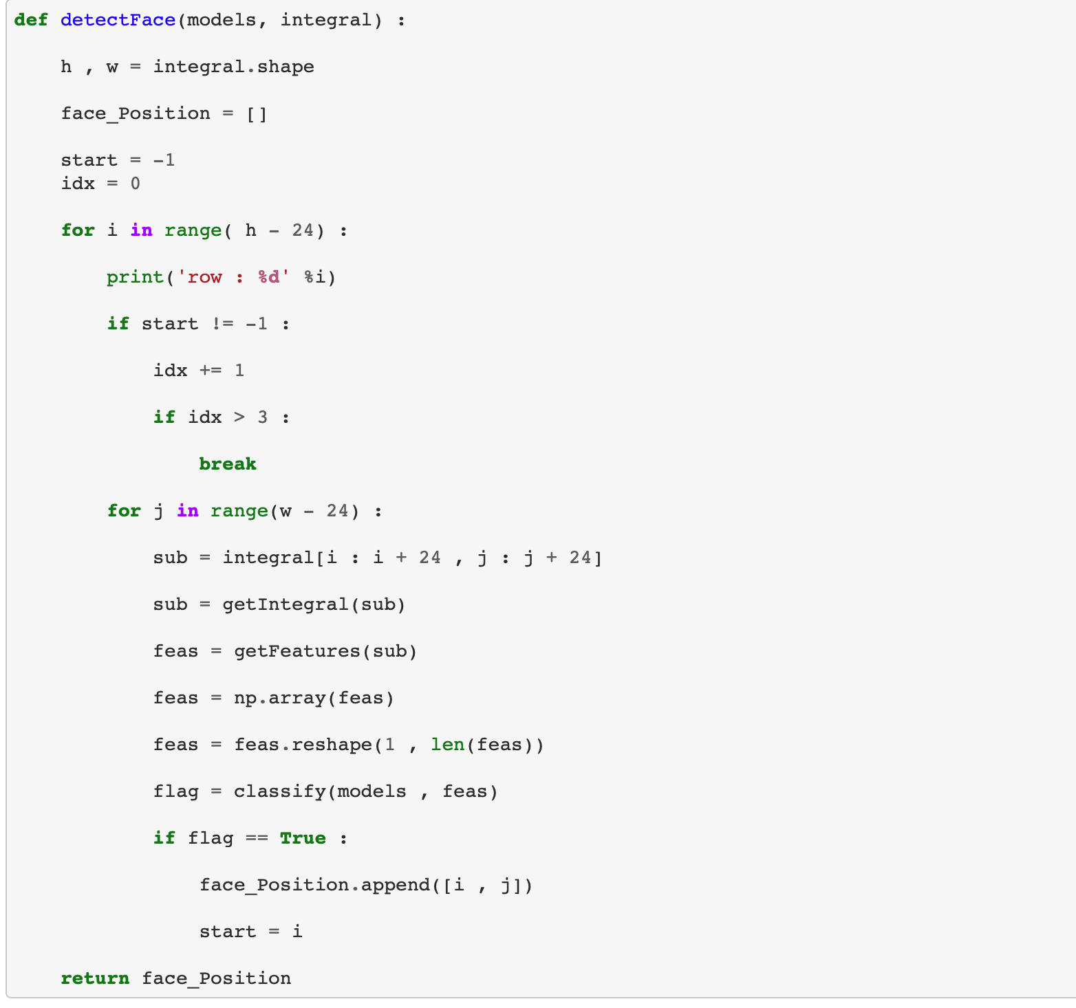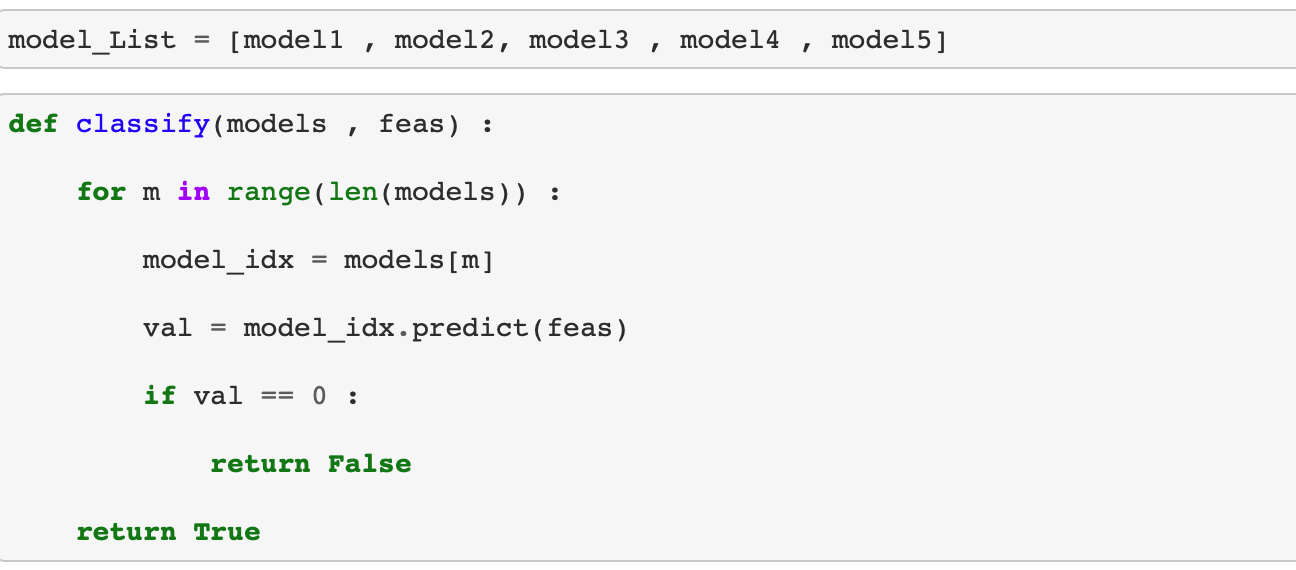 이제 앞서 만든 모델을 하나의 리스트에 저장하고 순차적으로 모든 모델에 대해서 얼굴이다 라고 판정이 되어야지만 최종적으로 얼굴이다 라고 판정이 되도록 classify 함수를 정의합니다.