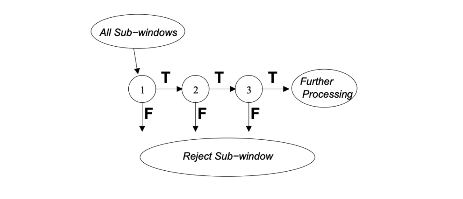 크기가 (24 ,24) 인 이미지가 입력되어서 첫 번째 adaboost모델에서 얼굴이 아니다 라고 판정이 되면 이 후 모델에 입력될 필요없이 바로 기각됩니다. 이런 방식이 아니라 처음 부터 많은 특징수를 선택해서 사용하면 모든 이미지가 그 많은 특징들을 하나하나 다 검사해야 하므로 시간이 많이 소모가 됩니다. 그에 비해서 이렇게 cascade를 하게 되면 모든 특징을 매번 검사할 필요 없이 순차적으로 이용이 됨으로써 대부분의 사진들은 10개의 weak classifier만을 사용하고 기각이 됩니다,