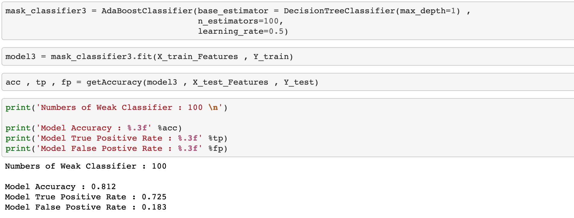 weak classifier 100개를 사용하였을 때 테스트 데이터를 이용해서 분류한 결과 정확도가 81.2%정도 입니다.