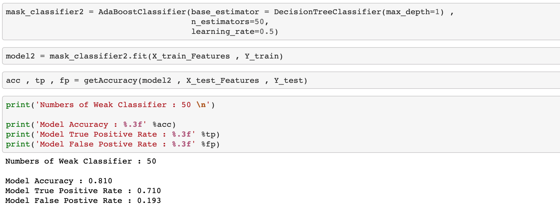 weak classifier 50개를 사용하였을 때 테스트 데이터를 이용해서 분류한 결과 정확도가 81%정도 입니다.