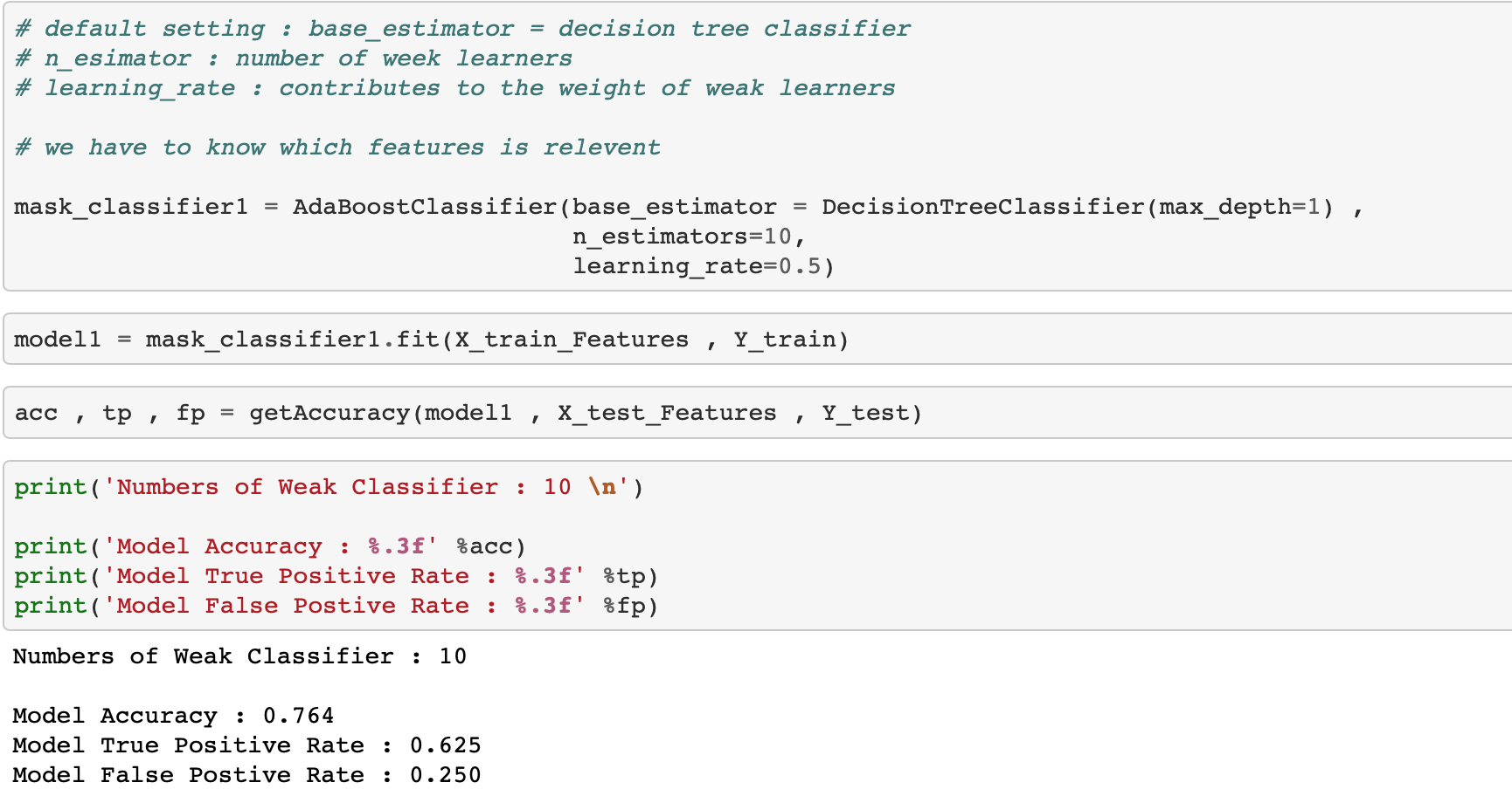 weak classifier 10개를 사용하였을 때 테스트 데이터를 이용해서 분류한 결과 정확도가 76%정도 입니다.