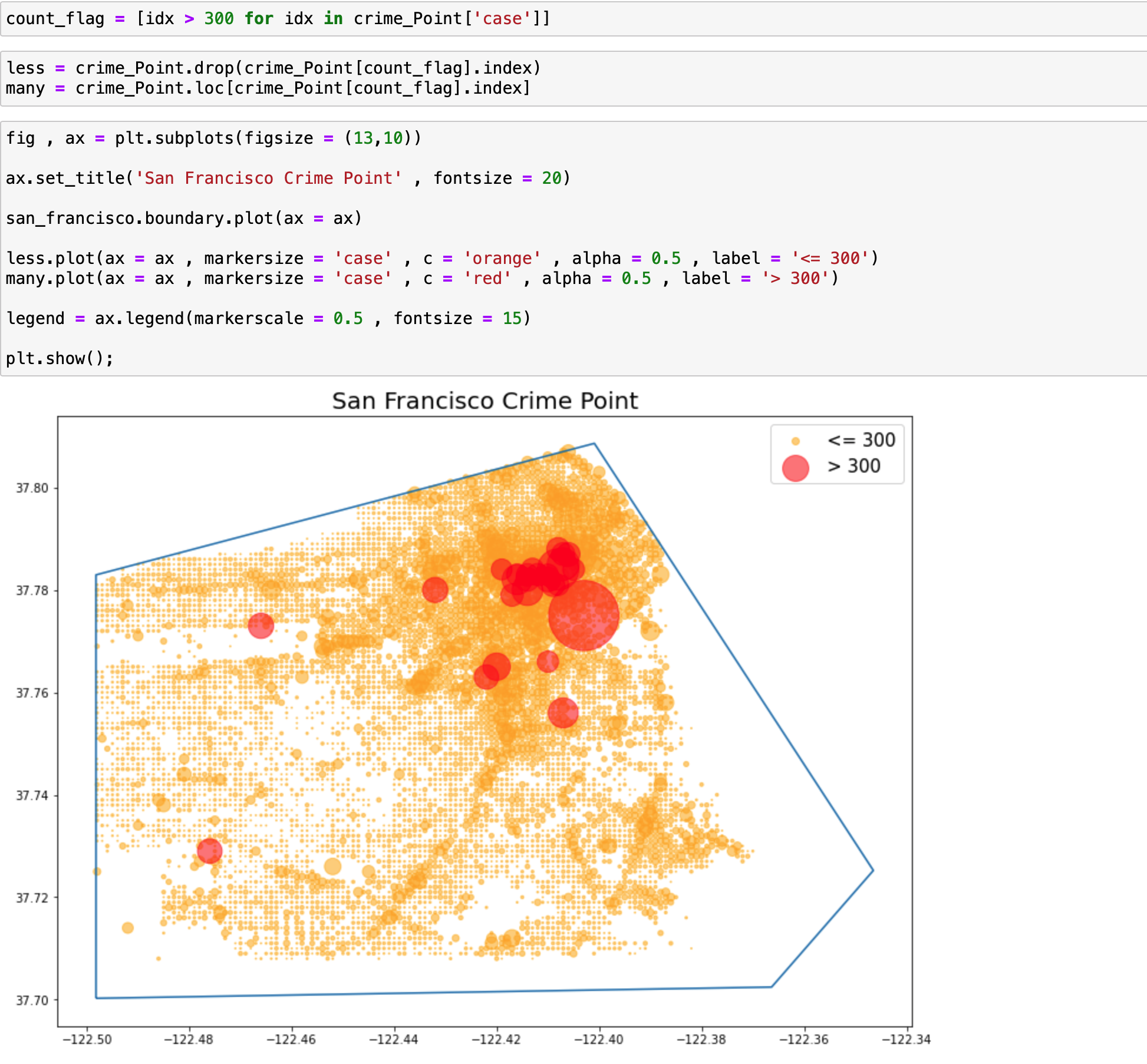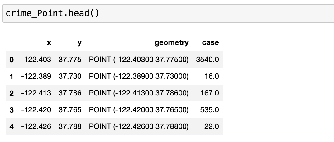 이제 최종적으로 샌프란시스코 범죄 데이터를 시각화할 GeoDataFrame 을 만들어줍니다.