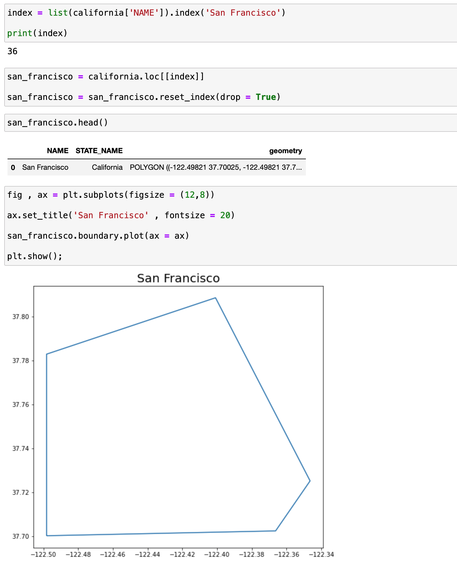 geodatafram에 있는 plot 함수를 이용하기 위해서 캘리포니아 geodataframe에서 샌프란시스코 행만을 추출한 뒤에 이를 다시 geodataframe으로 type 을 변경해주었습니다.
