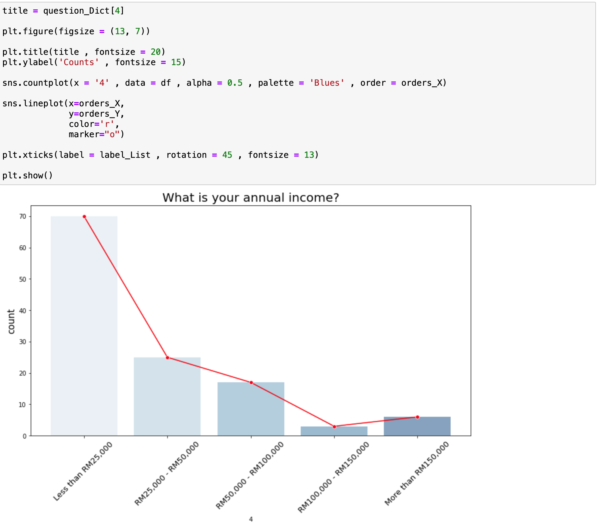앞서서 정리한 sns.countplot 을 이용해서 그린 bar garph에 각 bar의 값을 선으로 이은 line graph를 같이 그려보았습니다.