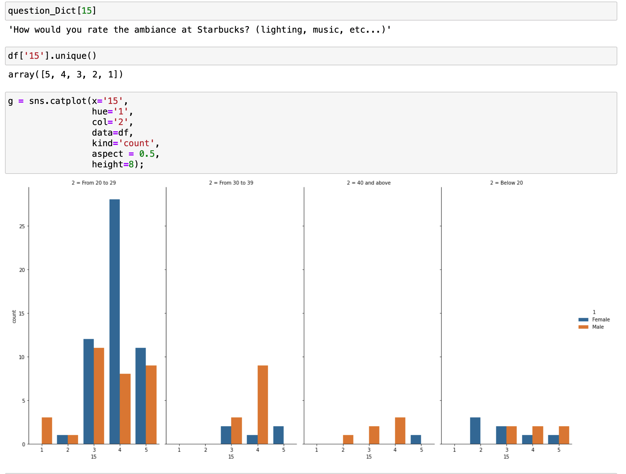 x값으로 15번쨰 질문에 대한 속성 (스타벅스 카페의 분위기에 대한 평가)을 입력하고 col에는 2번째 질문 연령대에 대한 속성을 입려하고 이를 hue = 1 즉 성별에 대한 속성을 입력함으로써 그래프를 바로 그릴 수 있었습니다.