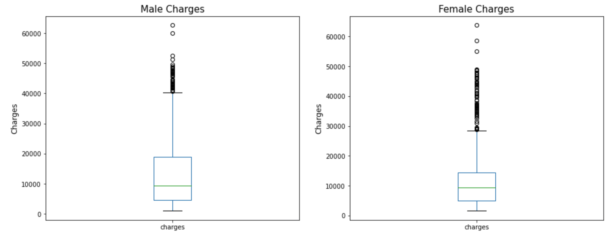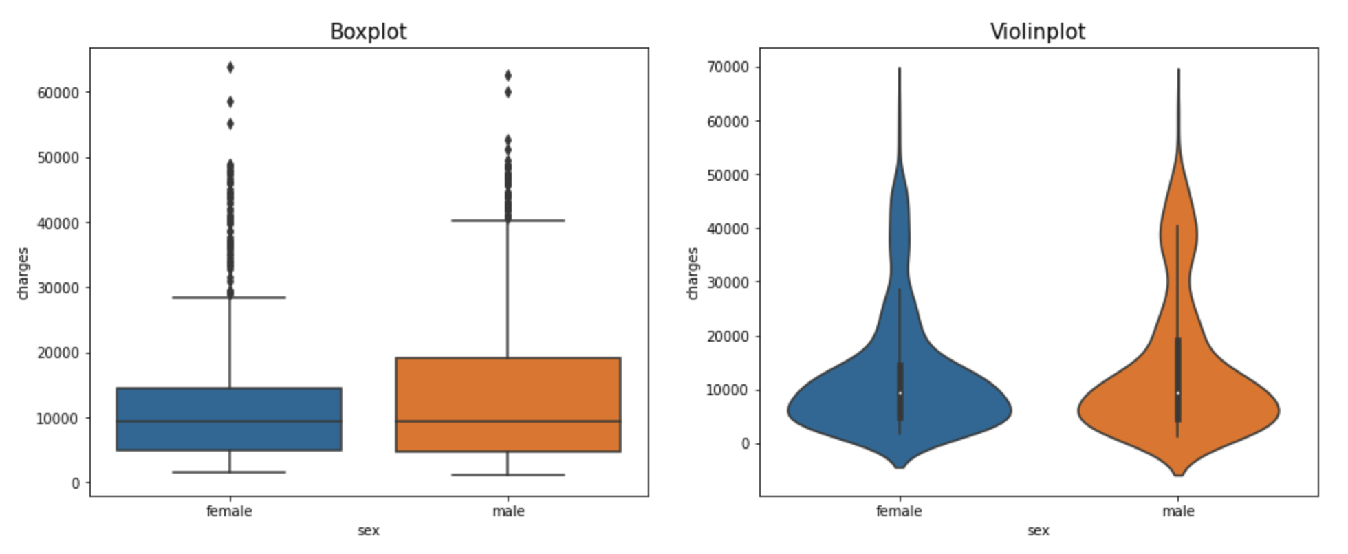 위에서 그린 Boxplot으로 성별간의 보험 청구 비용을 구분해본다면 남성의 경우 보험 청구 비용이 여성의 경우보다 더 많다라는 것을 확인할 수 있습니다.