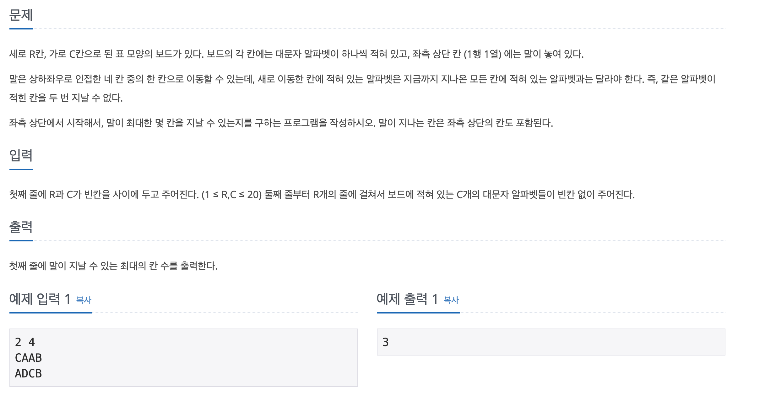 세로 R칸, 가로 C칸으로 된 표 모양의 보드가 있다. 보드의 각 칸에는 대문자 알파벳이 하나씩 적혀 있고, 좌측 상단 칸 (1행 1열) 에는 말이 놓여 있다. 말은 상하좌우로 인접한 네 칸 중의 한 칸으
