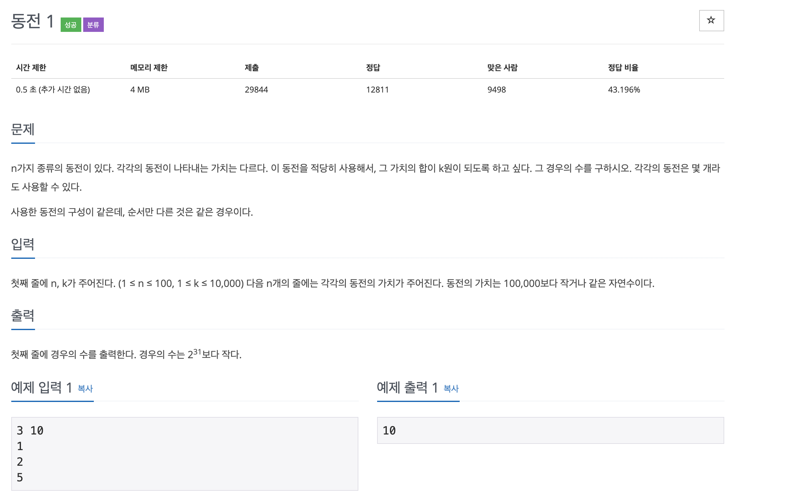 첫째 줄에 n, k가 주어진다. (1 ≤ n ≤ 100, 1 ≤ k ≤ 10,000) 다음 n개의 줄에는 각각의 동전의 가치가 주어진다. 동전의 가치는 100,000보다 작거나 같은 자연수이다.