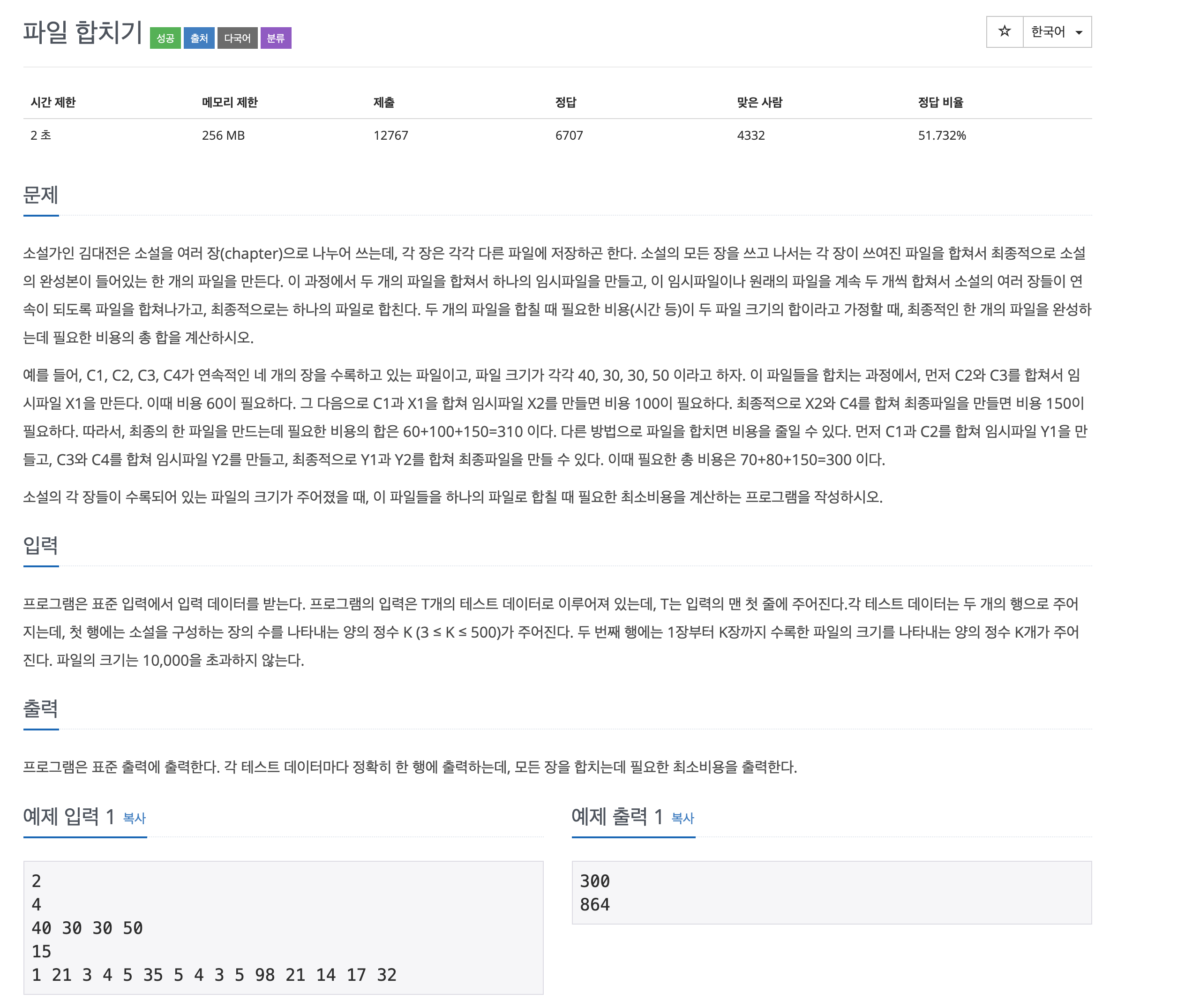 문제에서 구하고자 하는 것은 각 케이스에 따라서 한 행을 출력하는데 모든 장을 합치는데 필요한 최소 비용을 구하고자 하는 것입니다.