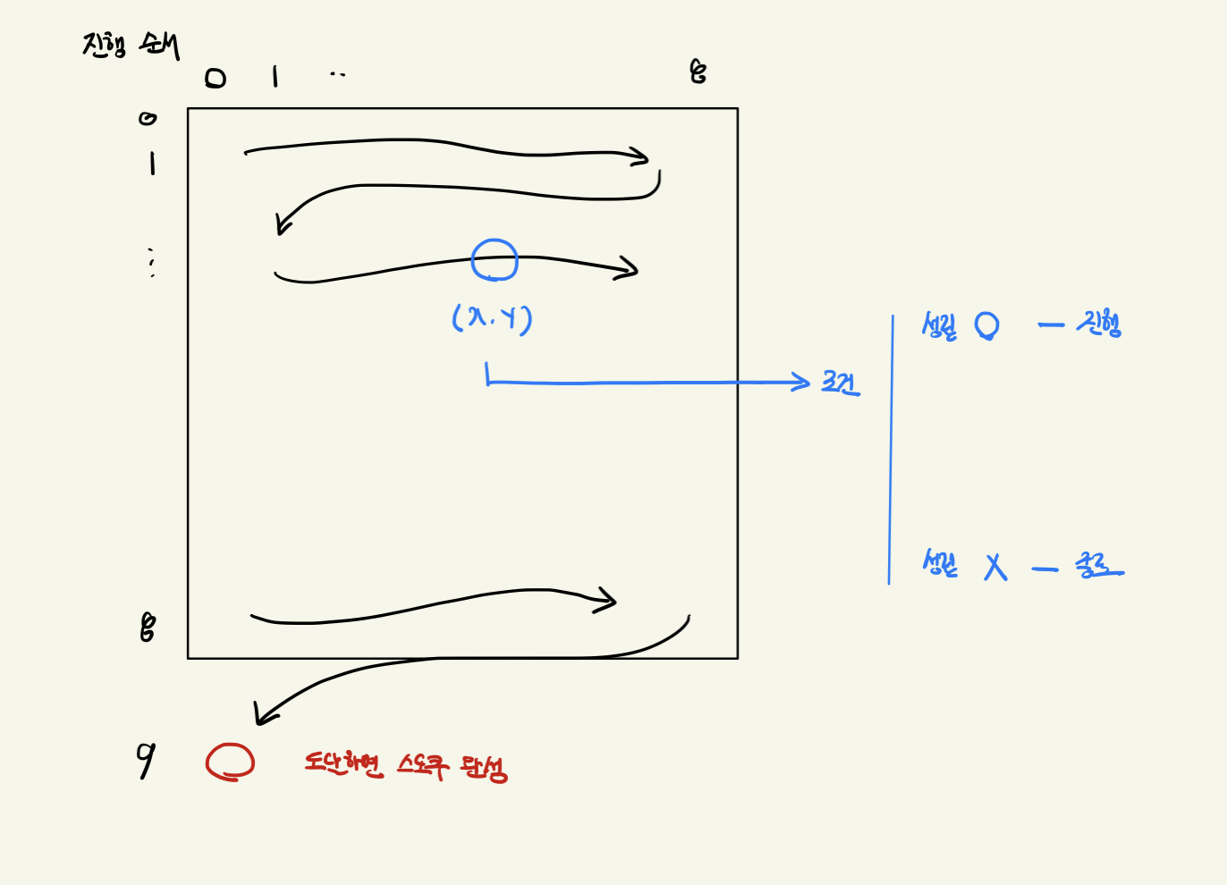 해서 주어진 제한조건에 어긋나지 않다면 해당 칸에 값을 채우고 다음 칸으로 이동하는 식으로 제귀를 구현할 수 있습니다. 과정을 정리하면 다음과 같습니다.