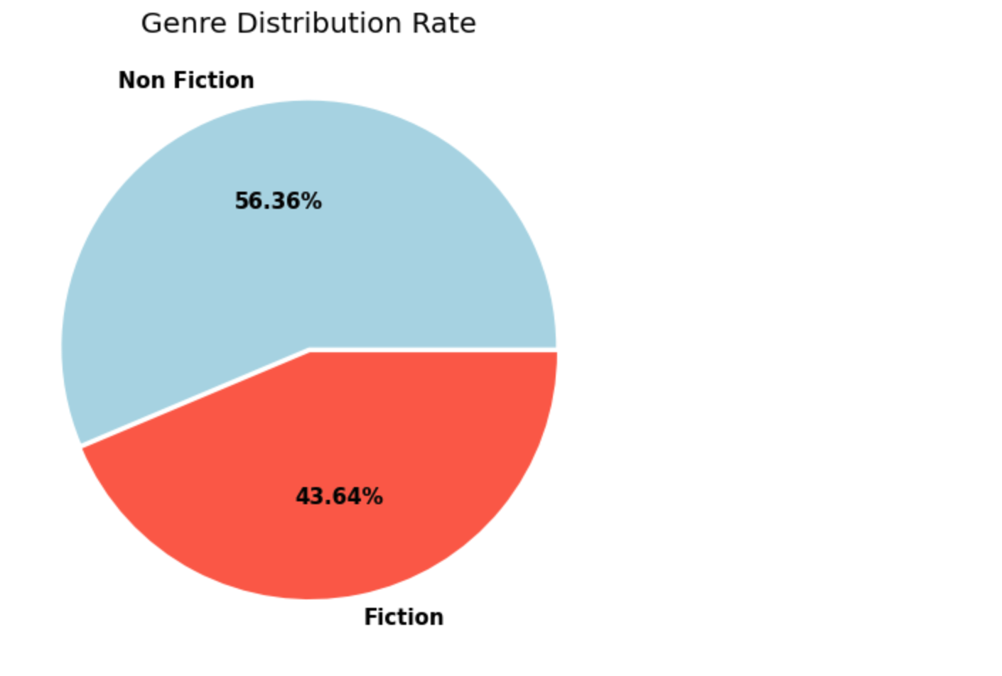 plt.pie가 핵심 함수이며 plt.bar와는 다르게 먼저 수치를 저장한 리스트 자료구조를 인자로 입력합니다. 그리고 나서 labels = [] 에 각 속성의 이름 혹은 의미가 무엇인지를 말해주도록 이산적인 속성의 리스트를 (위와 같은 경우에는 ['Non Fiction' , 'Fiction'] ) 를 입력합니다.