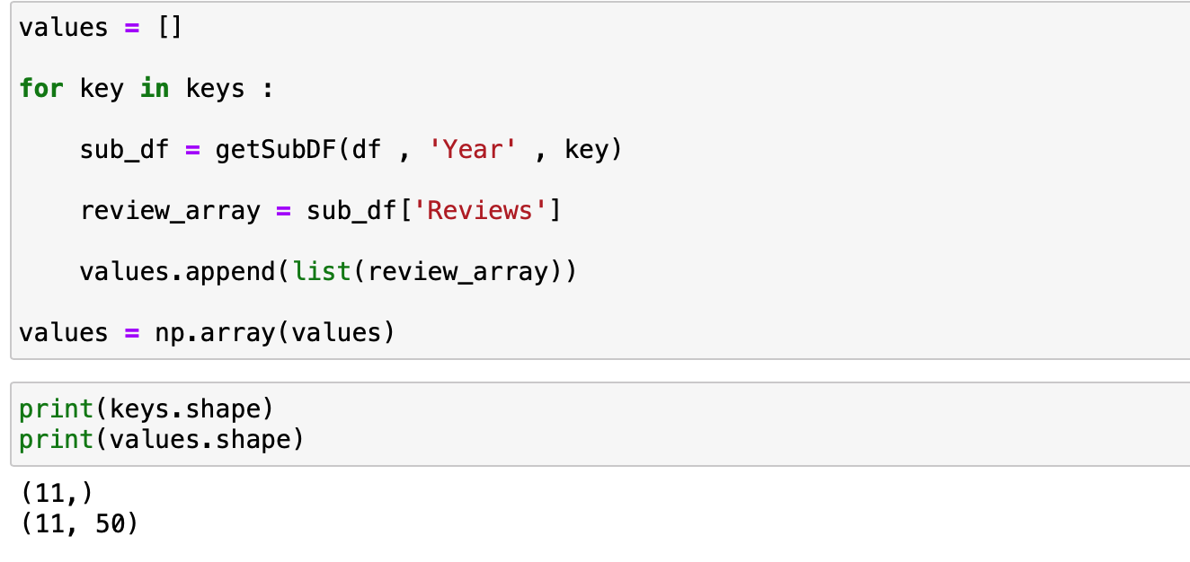 각 년도에 따른 리뷰 갯수에 대한 데이터를 추출해서 리스트를 만들고 이를 순차적으로 리스트에 넣어줌으로써 다중 리스트 자료구조를 최종적으로 2차원 배열을 만들어줍니다.