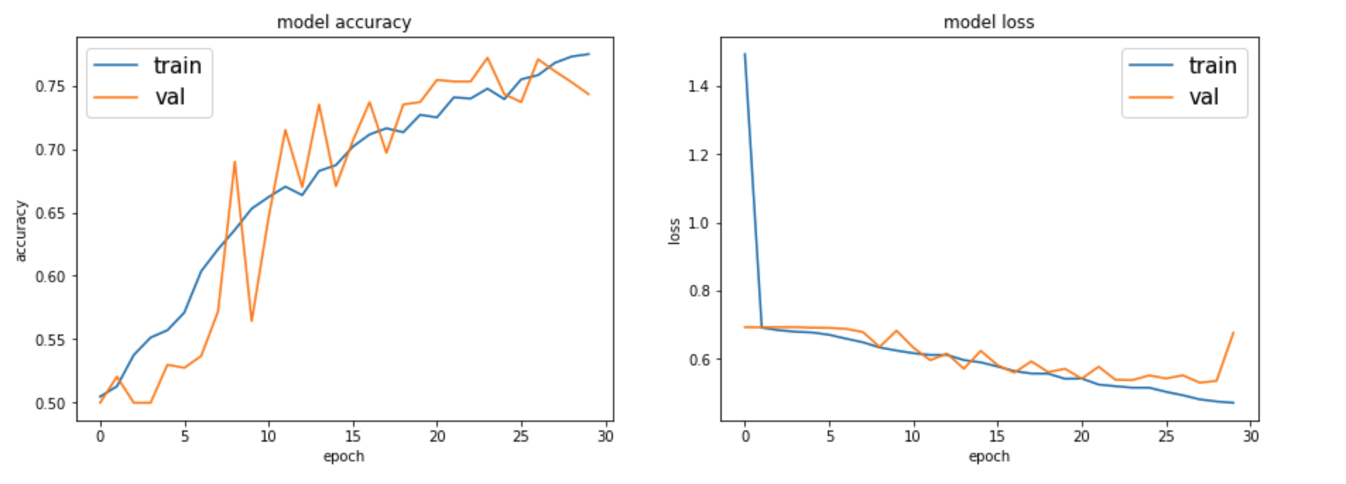 axes[1].legend(['train', 'val'], loc='upper right' , fontsize=15)