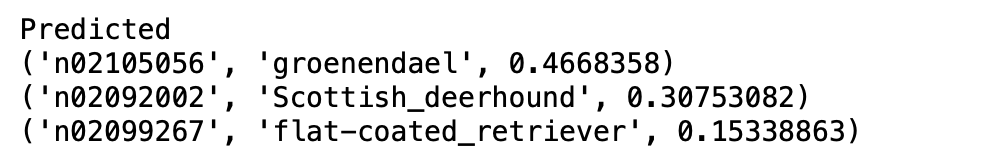 이제 이를 decode_predict 함수를 이용해서 해당 사진을 무엇으로 생각하는 지를 파악할 수 있습니다.