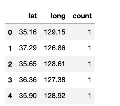 이제 이 데이터에 중복되는 위치가 있을 테니 중복되면 교통사고의 횟수를 더해주는 식으로 해서 데이터를 전처리해줍니다.