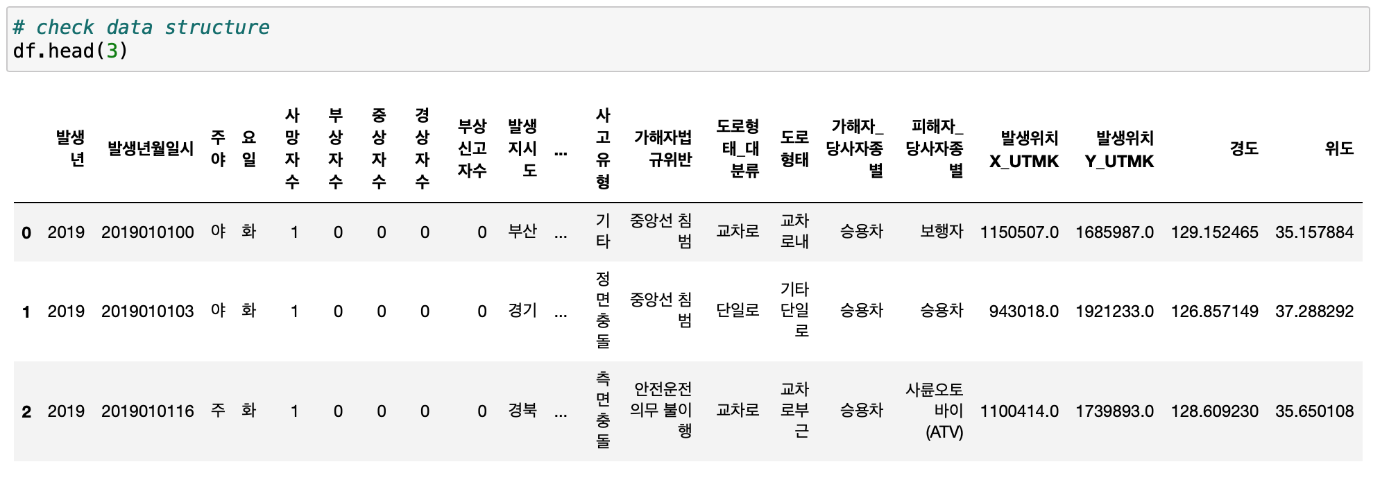 저는 위 공공데이터 포털에서 2019년에 일어난 교통사고 데이터를 이용해보도록 하겠습니다.