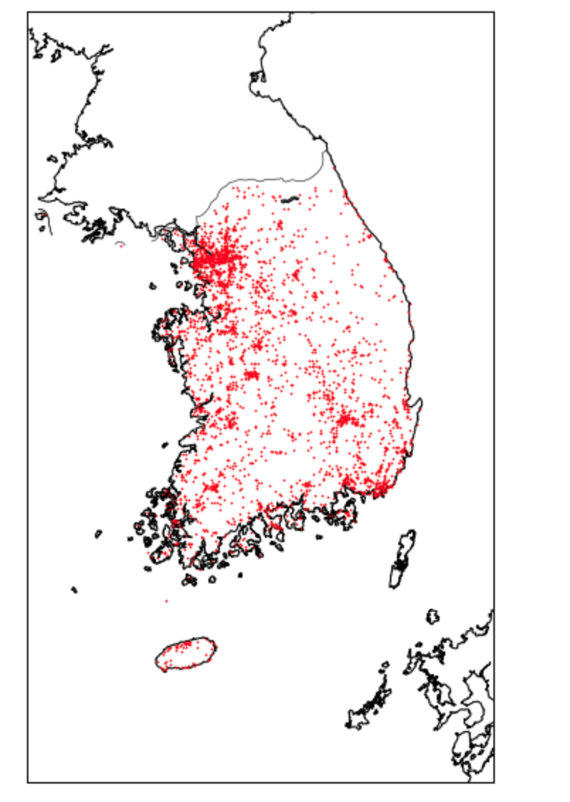 이제 저희는 경도 , 위도 그리고 교통사고 횟수를 파악하였으니 이를 앞서 그린 대한민국 지도에 시각화하고자 합니다.